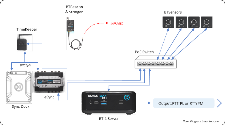 Hardware modules that connect directly to the BT-1 Server should be located in the same location outside of the tracking area. BTSensors must be positioned where they will not be disturbed and have the best unblocked view of the tracking area. TimeKeeper and eSync 2 Controller can be positioned closer to the tracking space.