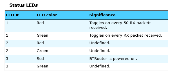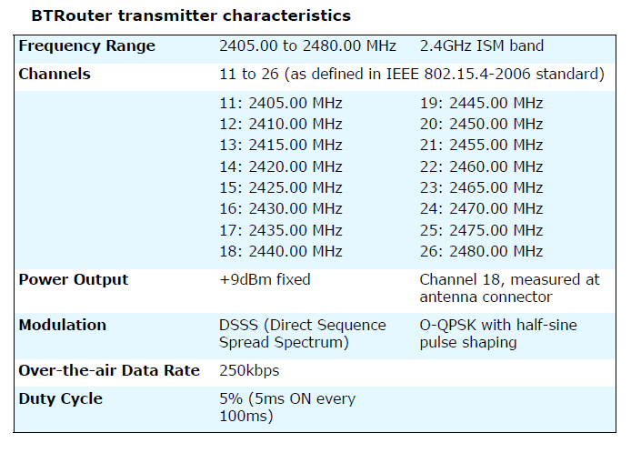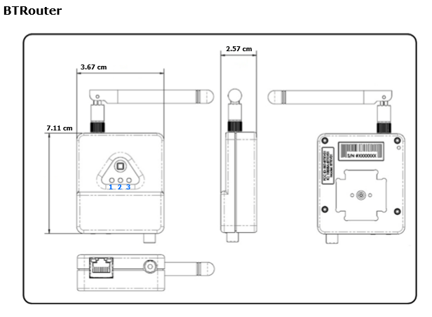 The BTRouter is a single wireless access point that uses a proprietary radio system running on 2.4 Ghz frequency to receive data from all BTBeacons. Data received includes BTBeacon button presses, battery status, configuration details as well as inertial measurement unit (IMU) data. IMU data can be used to calculate the BTBeacon’s orientation.