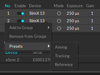 3. Right-click on the selected list of devices to access and choose the preset for the selected devices (Aiming, Tracking, or Reference) from the Presets menu that appears.                                   PresetsMenu2 2