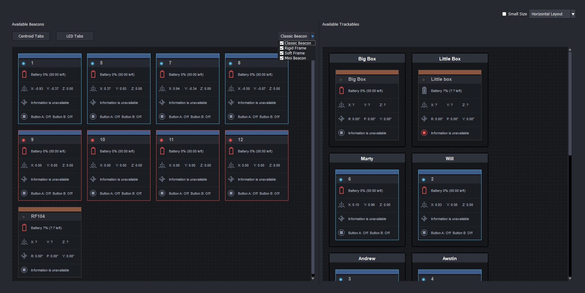 Centroid BTBeacon data is primarily information based on the average Cartesian coordinates position of all visible LEDs connecting to the BTBeacon. Additional information about the BTBeacon is also displayed.
