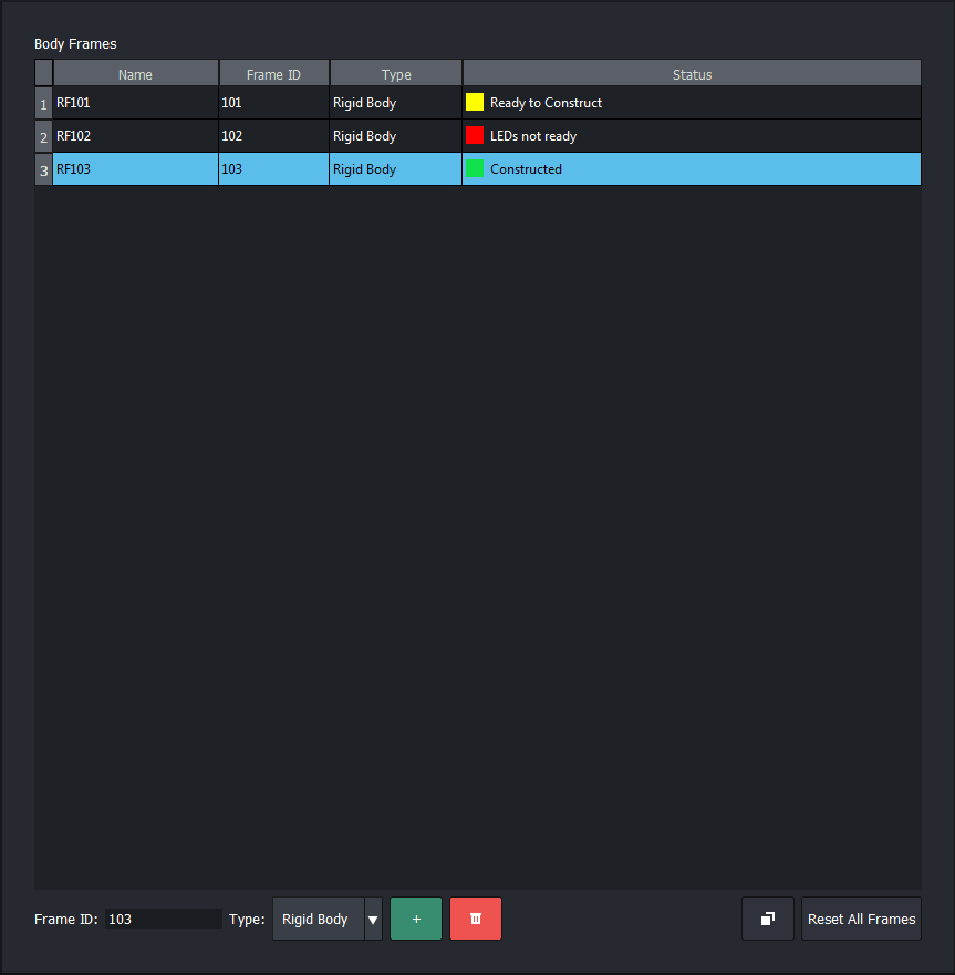 The Body Frames widget (or central widget) in the Frame Calibration View lists the Frames that have been created. The widget presents a table view listing the Name, Frame ID, the type of Frame (Soft or Rigid) and the Status of the Frame (LEDs not ready, Ready to Construct and Constructed). In the Body Frames widget, you can create, clone and remove Rigid and Soft Frames as well as assign a numerical name to a Frame, similar to a Beacon ID.