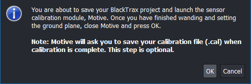 • Note: The step in the dialog box is optional. Motive will ask you to export your calibration file (.cal) when calibration is complete.