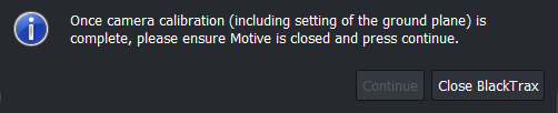• In BlackTrax, a dialog box appears asking to wait for calibration to finish before proceeding to reconnect to BTNet and the BTSensors.                                                        Calibration Continue Message