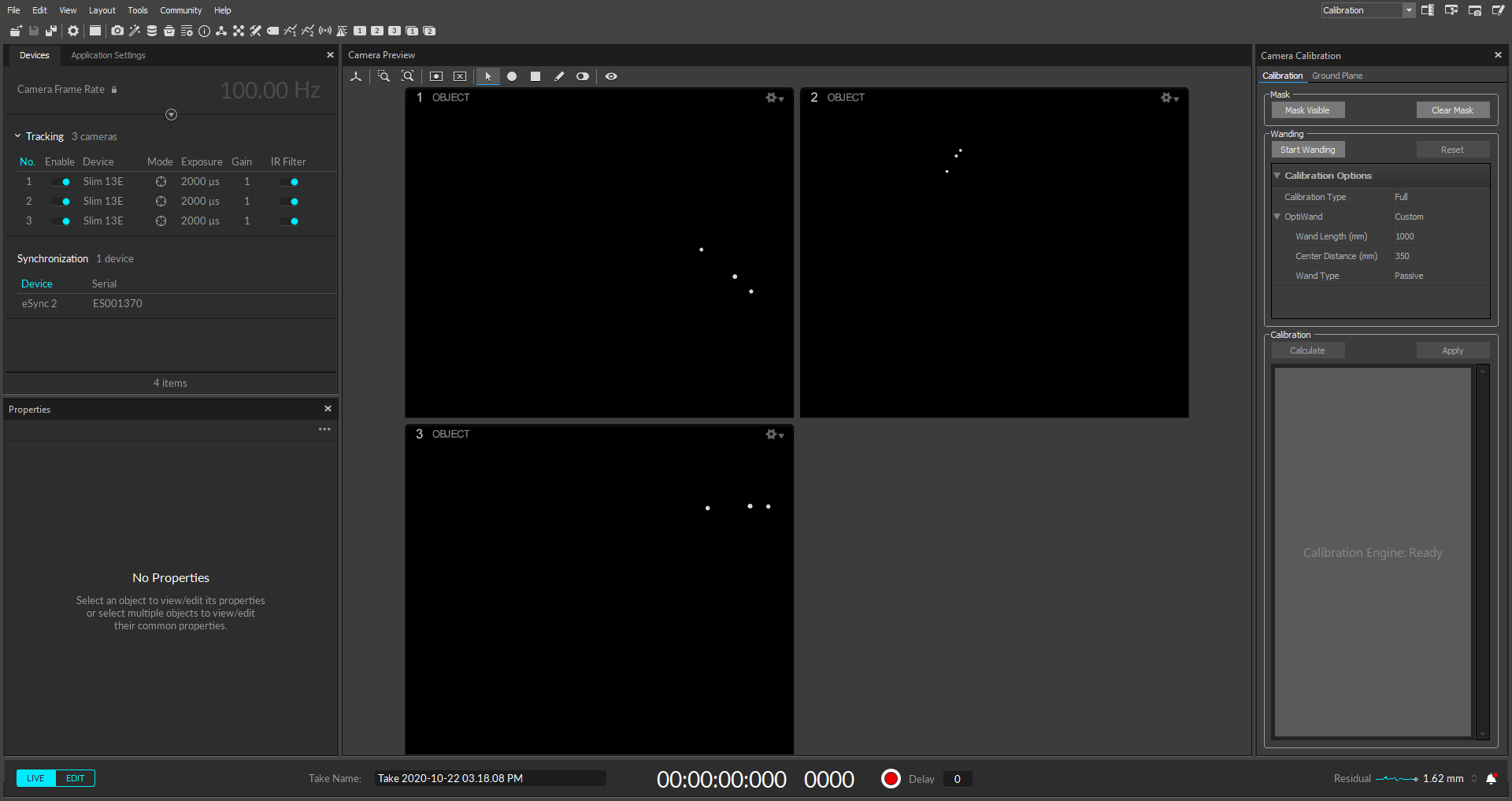 3. Motive opens in Calibration preset layout with only the 2D viewport and Sensor Calibration View is active.                                                                                                                                                               Motive Calibration View2 5