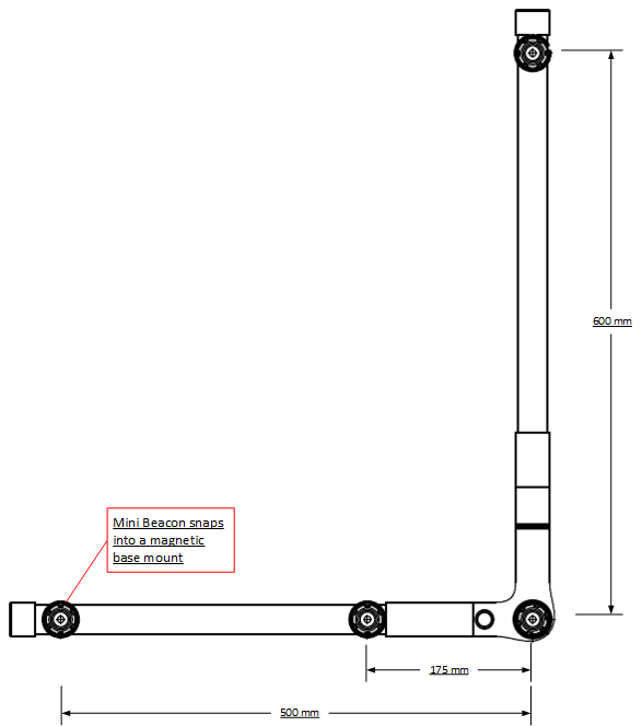 The Calibration Tool for BT-1 is a modular tool that converts into a Ground Plane and a Wand. Mini Beacons are placed on the magnetic mounts and emit infrared pulses that BTSensors see and for the BTSystem to generate a measurement point for calibration.