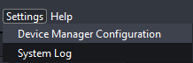 BlackTrax Device Manager » BlackTrax Device Manager » Device Manager User Interface » Menu Bar » Settings Menu Device Manager Settings Menu The Settings menu provides access to the Device Manager Configuration module and the System Log widget.