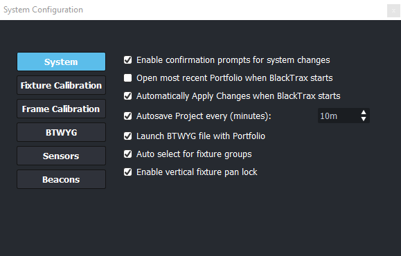 - Enable confirmation prompts for System Changes: Select this checkbox to display a dialog box asking for confirmation to apply the changes you have made in BlackTrax after clicking Apply Changes in Normal Mode and Fixture Calibration Mode.