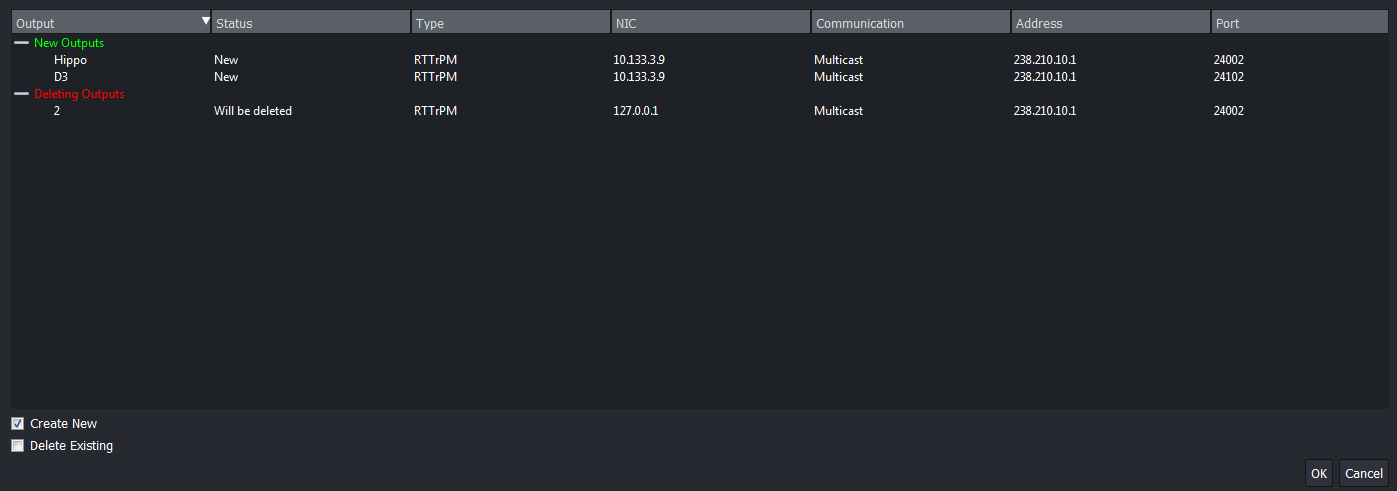 - Delete Existing: This option will delete any outputs in the Deleting Outputs section. These existing outputs are already present in the BlackTrax project.