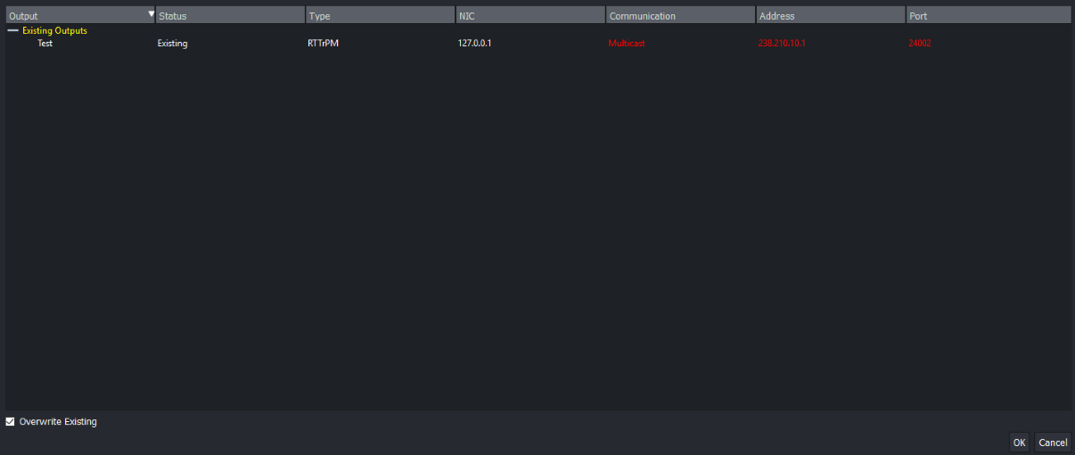 - Overwrite Existing: The current output configuration defined in the Existing Outputs section will be replaced with the settings of the output configuration being imported.