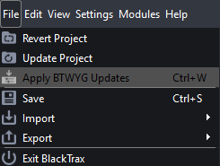 - In BlackTrax, from File menu, choose Apply BTWYG Updates.