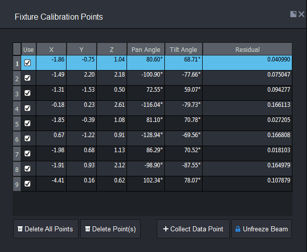 - Use: Checkbox to select or deselect the row of data points of the selected fixture. By deselecting a checkbox, that point will no longer be used as part of the calibration next time the solver is run (manually or automatically).