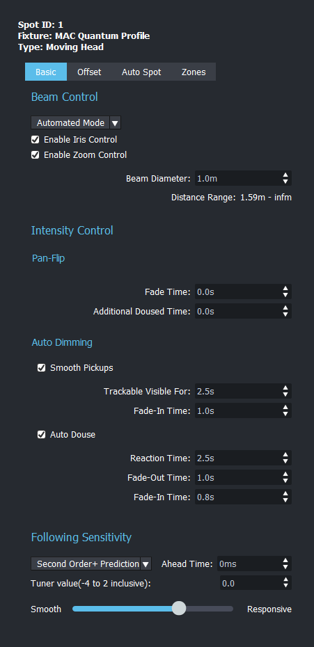 The Fixture Settings widget is where you configure how fixtures interact with Trackables in a specific chapter. Fixture Settings is separated into four tab sections: Basic, Offset, Auto Spot and Zones. The tabs will be explained in detail in the following pages.