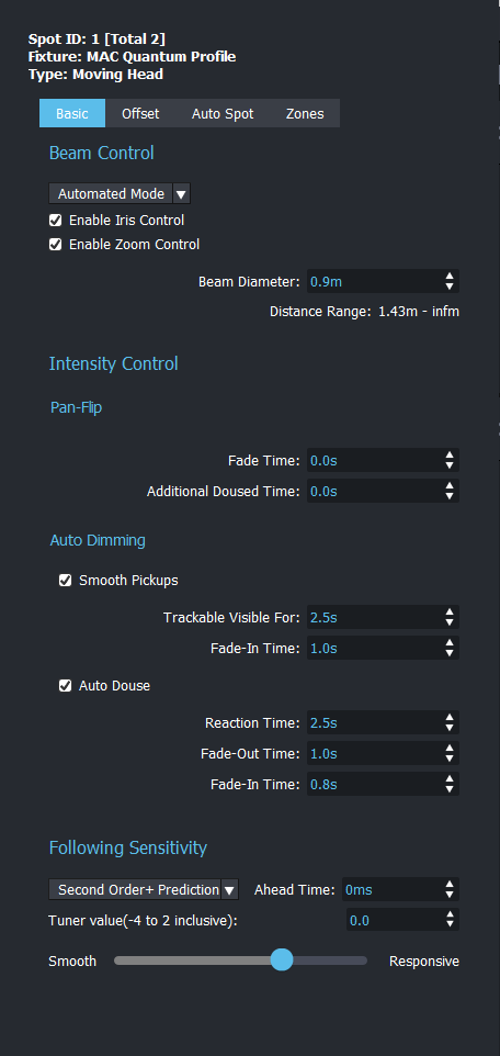 Moving Head and Moving Mirror are Moving Fixtures. All settings available in the Basic, Offset, Auto Spot and Zones tabs of the Fixture Settings widget are applicable to Moving Fixtures.