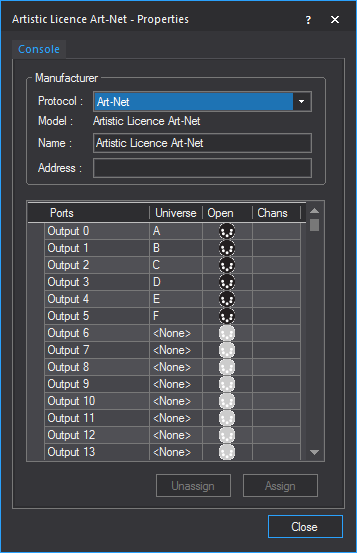 Device Manager with an Art-Net device and a BlackTrax console