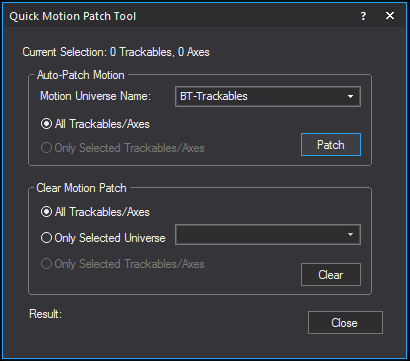 - Result: The Trackables are patched to the motion universe. The total number of Trackables patched will be reported at the bottom of the window.