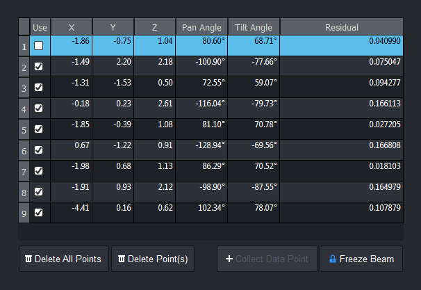 Calibration errors are differences between the calculated pan/tilt values of a fixture and the estimated pan/tilt values of the fixture, based on all measurement points used in the calibration. A calibration residual range between 0-0.08 indicates that a given measurement point is accurate relative to the overall fixture calibration. A collection of high quality samples is necessary for accurate fixture calibration. In this case, the smaller the number, the better.