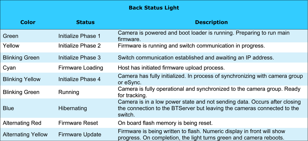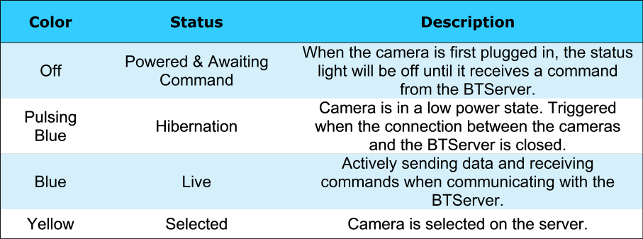 The Slim Series sensors have a front LED status light to indicate their current state in relation to the BTServer. The following table lists the default status light colors.