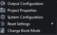 The Settings menu contains links to all the widgets that contain settings for the software, the current project or the option to change between Chapter or Book mode.