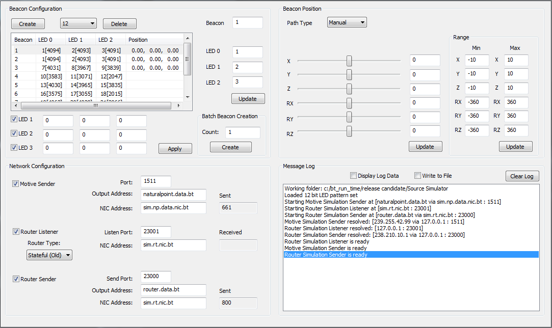 The Simulator Module is where the identification and positional data of BTBeacons can be created, configured, and managed in simulation. The Simulator can send and receive simulated data to and from the other modules. The sections in the Simulator layout are: