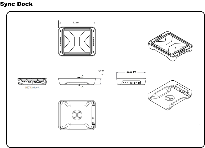- Blue LED: When the Sync Dock is plugged into a power source, the blue LED at the front panel lights up.