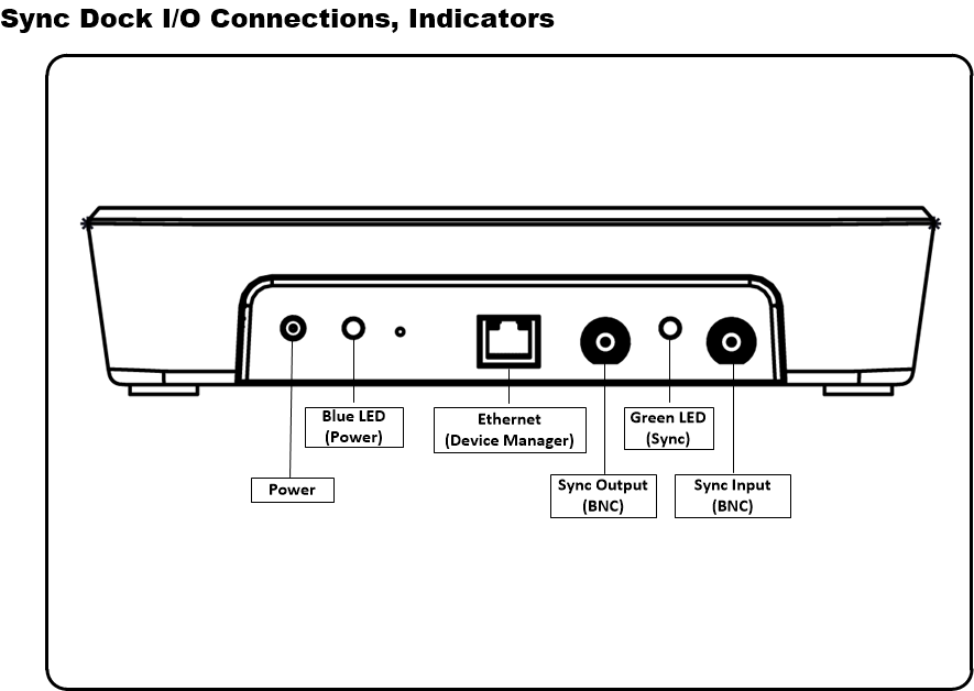 - Sync Output (BNC): Connect and send sync calibration data to another Sync Dock through the BNC connector.