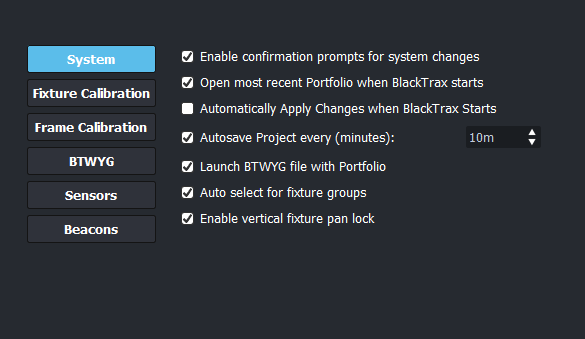 The System Configuration widget is where BlackTrax software behavior can be configured.