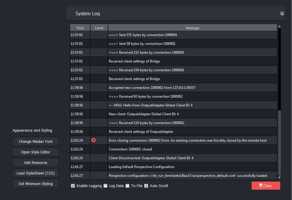 The System Log widget displays system information about the BlackTrax project. The various features of the system log are: