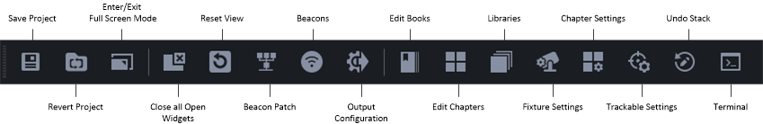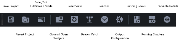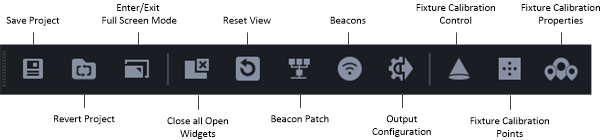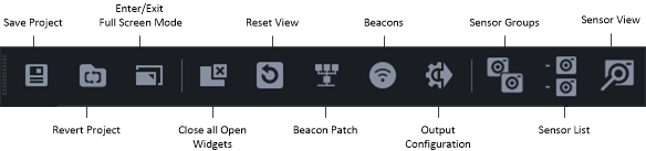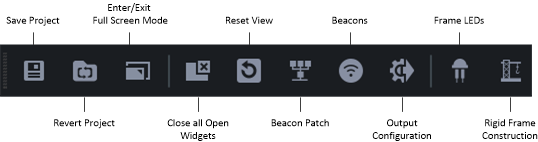 - Main: On top of the left side, contains basic operations such as saving , as well as common functions found throughout the software such as Reset View, Beacon Patch, and a fullscreen option. On the right side, you have access to the most used docking widgets found in your current view. The right side of the toolbar will change depending on which view you are currently in.