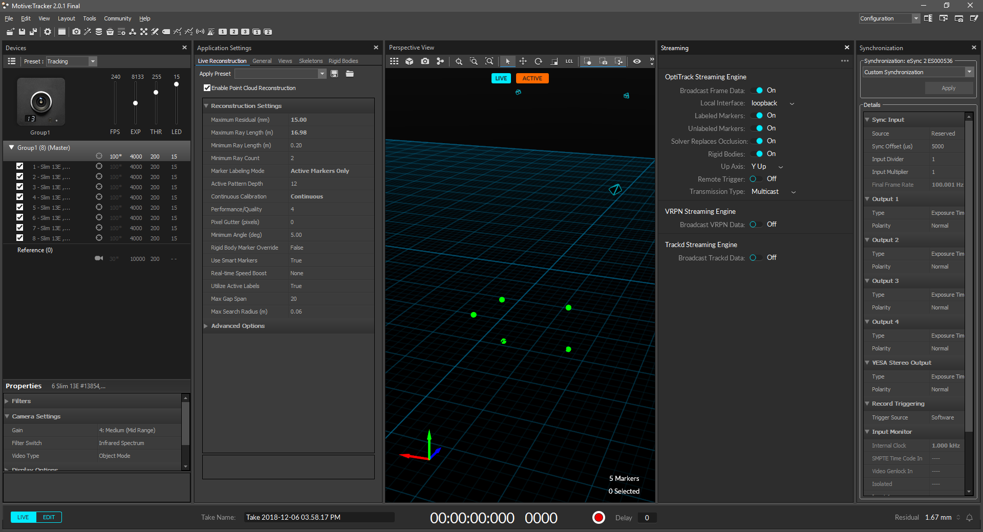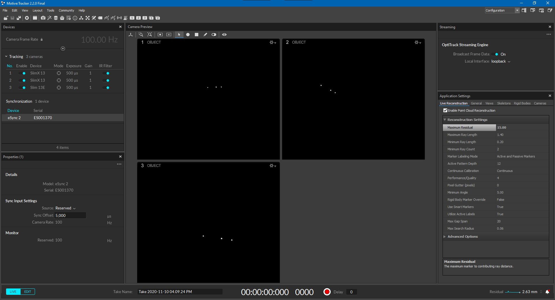 - Note: After Calibration, Motive will set the Maximum Residual as low as possible but in most situations this is not forgiving enough. We recommend you increase the Maximum Residual to at least 15 mm after calibration. You may also increase it higher if calibration is poor or the BTSensors have moved since calibration. Keep in mind the Active Residual in the Status Bar, and ensure that value is as low as possible. If the value is too high for acceptable use (greater than 5 mm in most cases and 10 mm in extreme cases), you should consider re-calibrating your space.