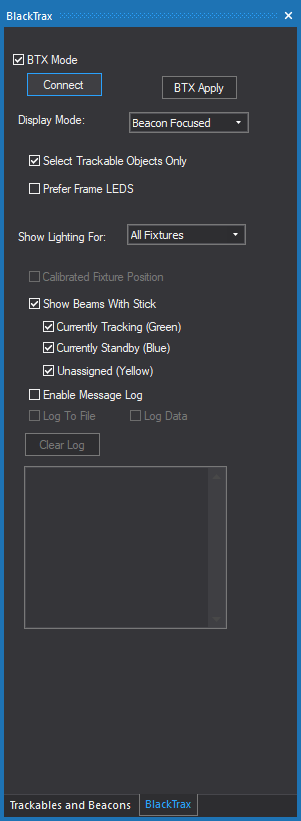 - In the BlackTrax panel, select the BTX Mode checkbox to enable the option to connect with BlackTrax.