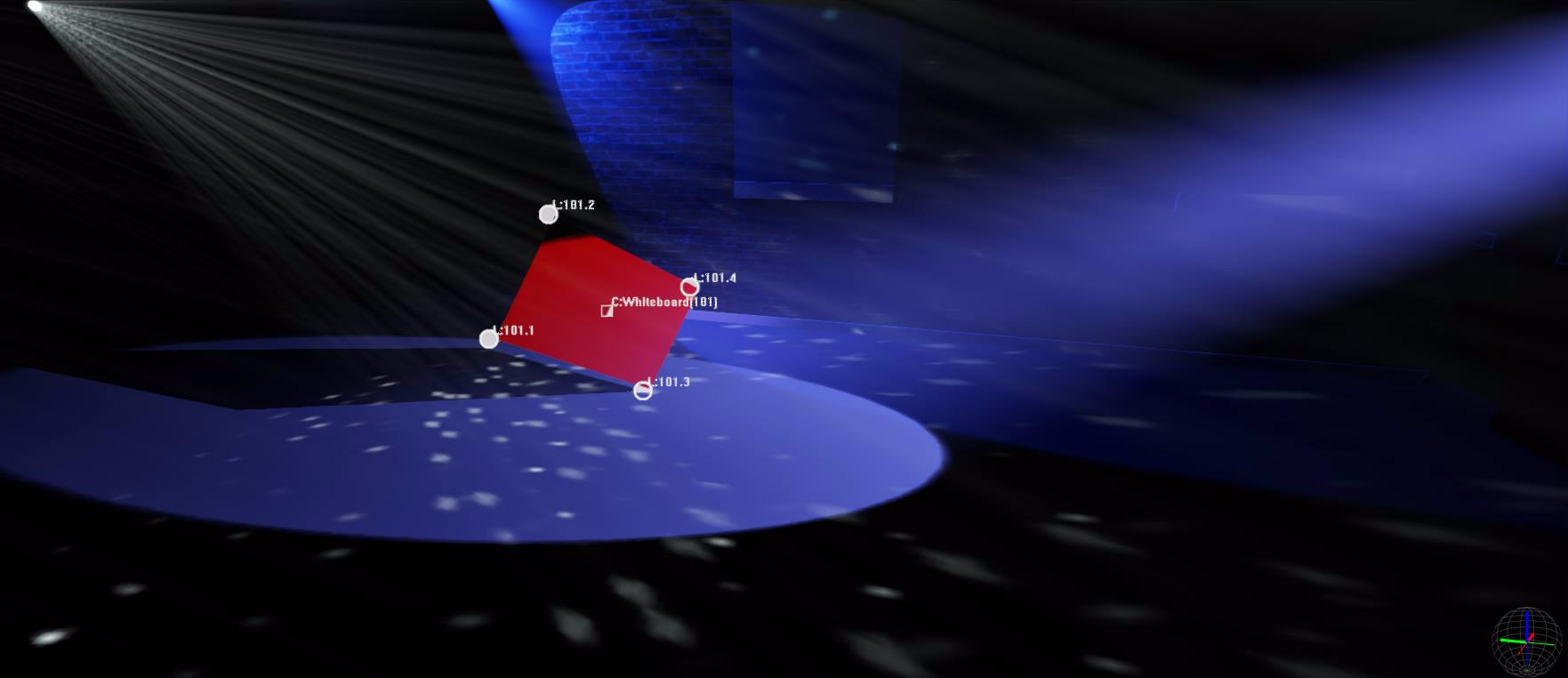- When a Centroid is selected, its color turns to white and the text label identification appears. For example, the screenshot (above) shows "C:Whiteboard(101)" which indicates the Centroid associated with Beacon 101 is patched to the Whiteboard trackable.