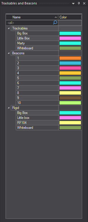 - Result: The Trackables and Beacons panel appears and displays the list of Trackables, Beacons, and Frames associated with the connected BlackTrax project.
