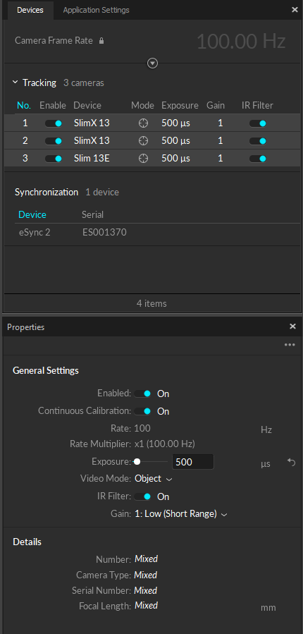 - With the Camera(s) selected, set Video Mode and IR Filter in the Properties window.