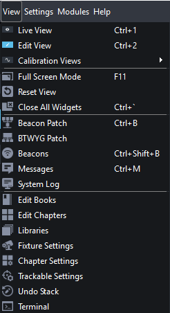 The top section of the View menu contains you're three core views (Live View, Edit View, Calibration Views), and Calibration Views' three sub-views (Fixture View, Frame Calibration View, and Sensor Calibration View). Clicking on one will take you to the selected view. Hovering over Calibration Views will give you access to the three sub-views.